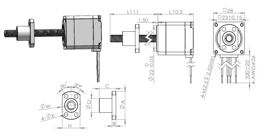 | Nut Size | A | B | C | D | H | W | X | Precision | Positioning Accuracy | Full Beat | Axial Clearance | Rated Load (N) |