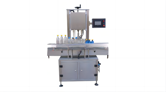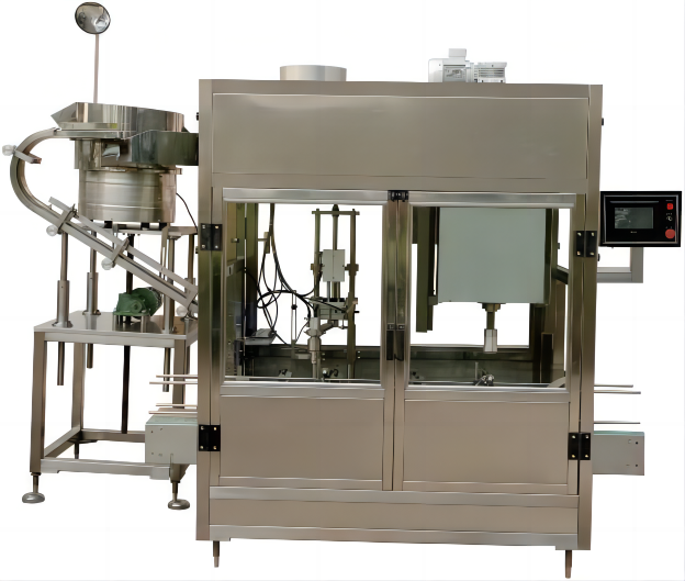 This machine is a capping machine with a capping device designed for metal caps. The manipulator cap grabber places the sorted cap on the opening of the bottle to be unscrewed. The manipulator cap grabber first presses the cap once, and then tightens the cap twice through the head.