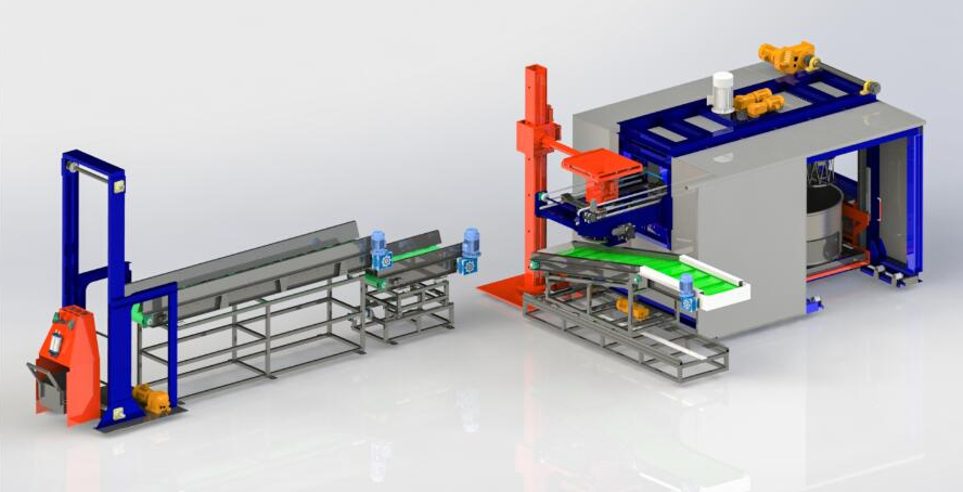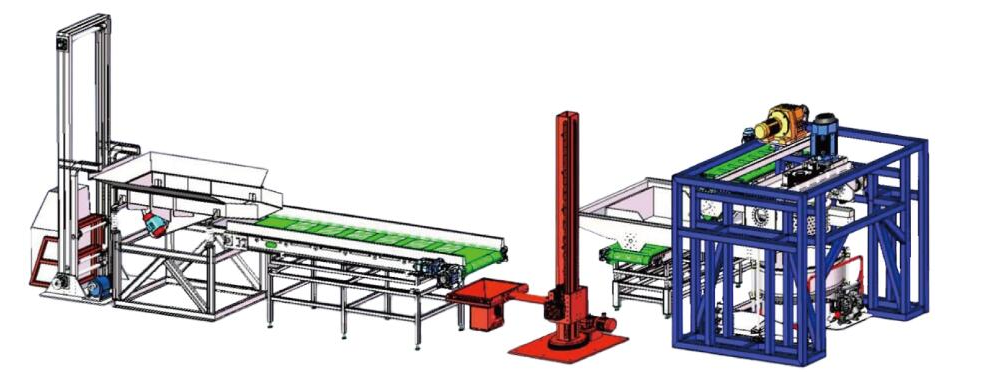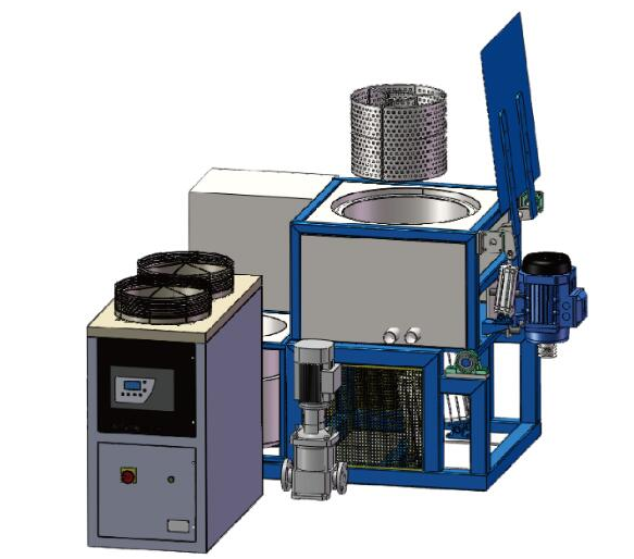 3. Equipment structure composition and description: The coating system sets the integration of dipping, dumping and unloading, including flip transfer system, No.1 weighing conveyor, No.2 conveyor, vertical feeding system, spreader, dipping tank lifting mechanism, centrifugal drying mechanism, flip discharging mechanism and other components. The dipping tank lifting mechanism can lift the dipping tank, and the centrifugal drying mechanism can remove the excess liquid on the surface of the workpiece in that it can rotate forward and reverse to facilitate the flow of the accumulated liquid in the grooves on the workpiece. The flip discharging mechanism is used for discharging the workpiece after centrifugation. Weighing mechanism (No.1 weighing conveyor, No.2 conveyor, vertical feeding system) can accurately calculate the required loading capacity of the basket.