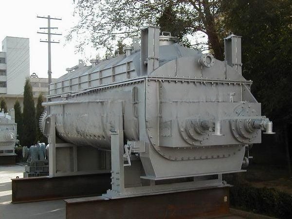 Wedge hollow blades are densely arranged on the hollow shaft, and the thermal medium flows through the blades through the hollow shaft. The heat transfer area per unit effective volume is large, and the temperature of the heat medium ranges from - 40 ℃ to 320 ℃, which can be either water vapor or liquid: such as hot water, heat transfer oil, etc. Indirect conduction heating does not carry air away heat, and the heat is used to heat materials. The heat loss is only the heat dissipation to the environment through the insulation layer of the body. The heat transfer surface of wedge blade has self-cleaning function. The relative movement of the material particles and the wedge surface produces the washing effect, which can wash off the attached materials on the wedge surface, so that the clean heat transfer surface is always maintained during operation. The shell of the paddle dryer is Ω type, and two to four hollow mixing shafts are generally arranged in the shell. The shell has a sealed end cover and an upper cover to prevent the leakage of material dust and give full play to its role.