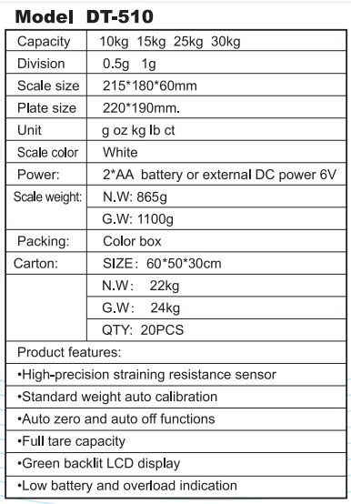 | ·High-precision straining resistance sensor ·Standard weight auto calibration ·Auto zero and auto off functions ·Full tare capacity ·white or green backlit LCD display ·Low battery and overload indication | |