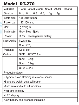 | ·High-precision straining resistance sensor ·Standard weight auto calibration ·Auto zero and auto off functions ·Full tare capacity ·white or green backlit LCD display ·Low battery and overload indication | |