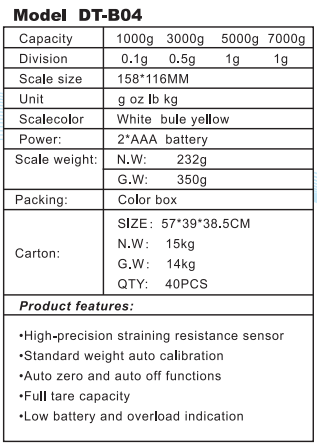 | ·High-precision straining resistance sensor ·Standard weight auto calibration ·Auto zero and auto off functions ·Full tare capacity ·Low battery and overload indication | |