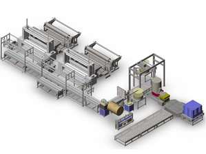 The automatic cloth roll processing and packaging system can be equipped with multiple robots in one line, with a processing capacity of up to 700 cloth rolls per hour (the minimum width of the cloth roll is 60mm, the maximum diameter is 1600mm), 10 master rolls per hour, and 65 large packages (the maximum packaging height is 2700mm)
