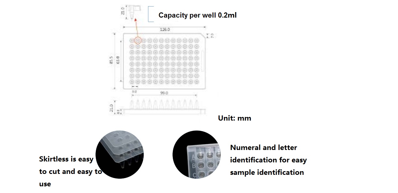 ● Ultra-thin wall design, fast and uniform heat transfer; semi-skirt design is stable in structure, no skirt design is easy to cut, convex plate can be used for 8 tube covers, multi-specimen simultaneous experimental operation