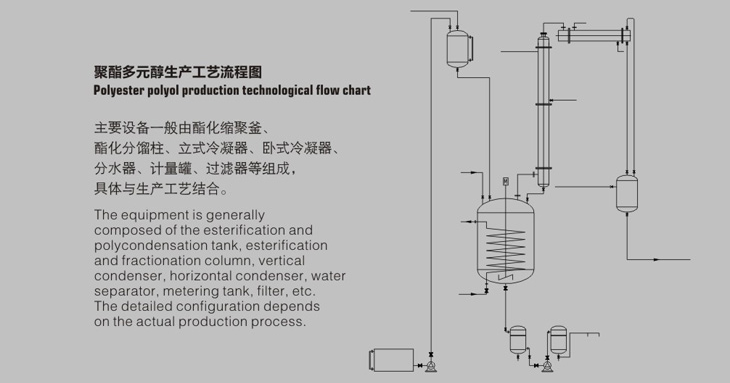 The equipment is generally composed of the esterification and polycondensation tank,esterification and fractionation column,vertical condenser, horizontal condenser, water separator,metering tank,filter,etc. The detailed configuration depends on the actual production process.